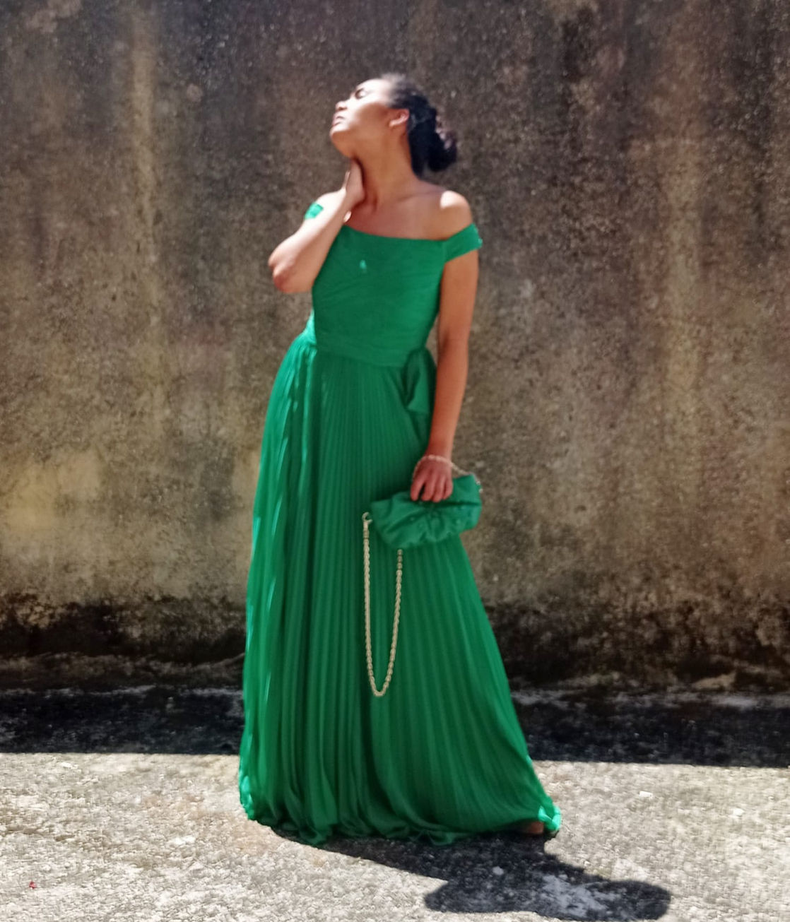 Particolarissimo abito lungo adatto a cerimonie ed impegni importanti- il corpetto è definito da un incastro di tessuto plissettato che unito alla parte inferiore forma una gonna lunga ai piedi e plissettata- la scollatura lascia le spalle completamente scoperte.